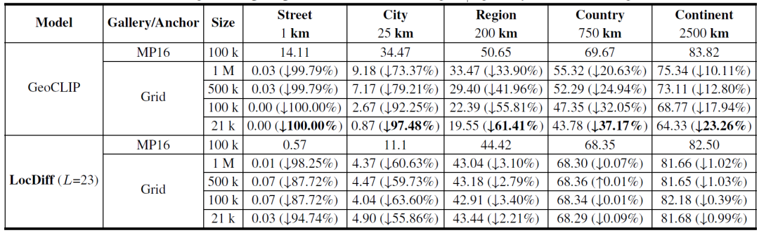 相比之下,LocDiff 展现出稳健的泛化能力。如下表所示,实验验证表明,无论锚点采用 MP16 图库位置还是均匀网格点,也无论锚点数量从 2.1 万增至 100 万,LocDiff 的性能均保持稳定,进一步印证了其鲁棒性。