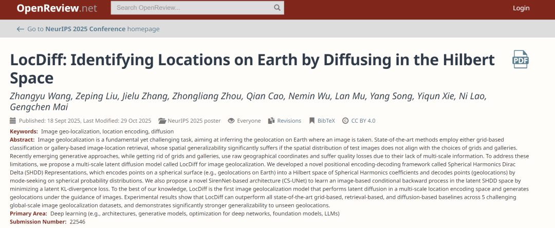 相关研究成果以「LocDiff: Identifying Locations on Earth by Diffusing in the Hilbert Space」为题,已收录于 NeurIPS 2025。