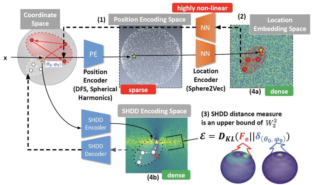 然而现有方法在实现上述目标时面临双重困境:若采用的位置编码空间本身呈稀疏特性,扩散模型将难以在其中进行稳定的扩散过程,直接导致训练收敛困难与解码精度低下;若转而使用密集的位置嵌入空间(Location Embedding Space),虽能支撑扩散过程的顺利进行,但位置编码与坐标空间之间存在的高度非线性映射,会使得「从嵌入结果反推正确地理坐标」的任务陷入僵局——嵌入空间中距离的最小化,往往无法对应地理空间中距离的最小化。