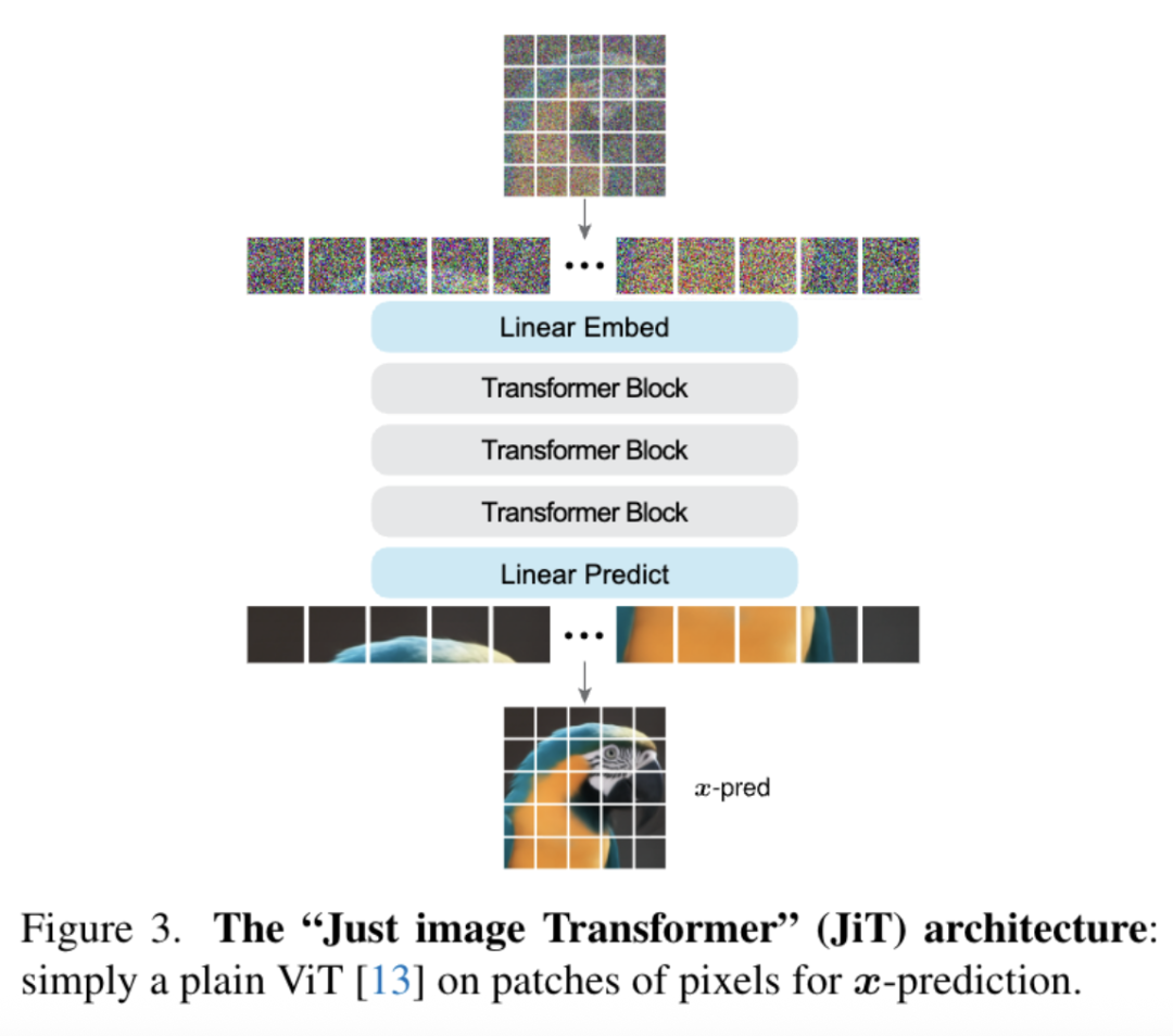 JiT就像一个标准的ViT,它将原始像素切成大Patch(维度可高达3072维甚至更高)直接输入,唯一的改动就是将输出目标设定为直接预测干净的图像块。
