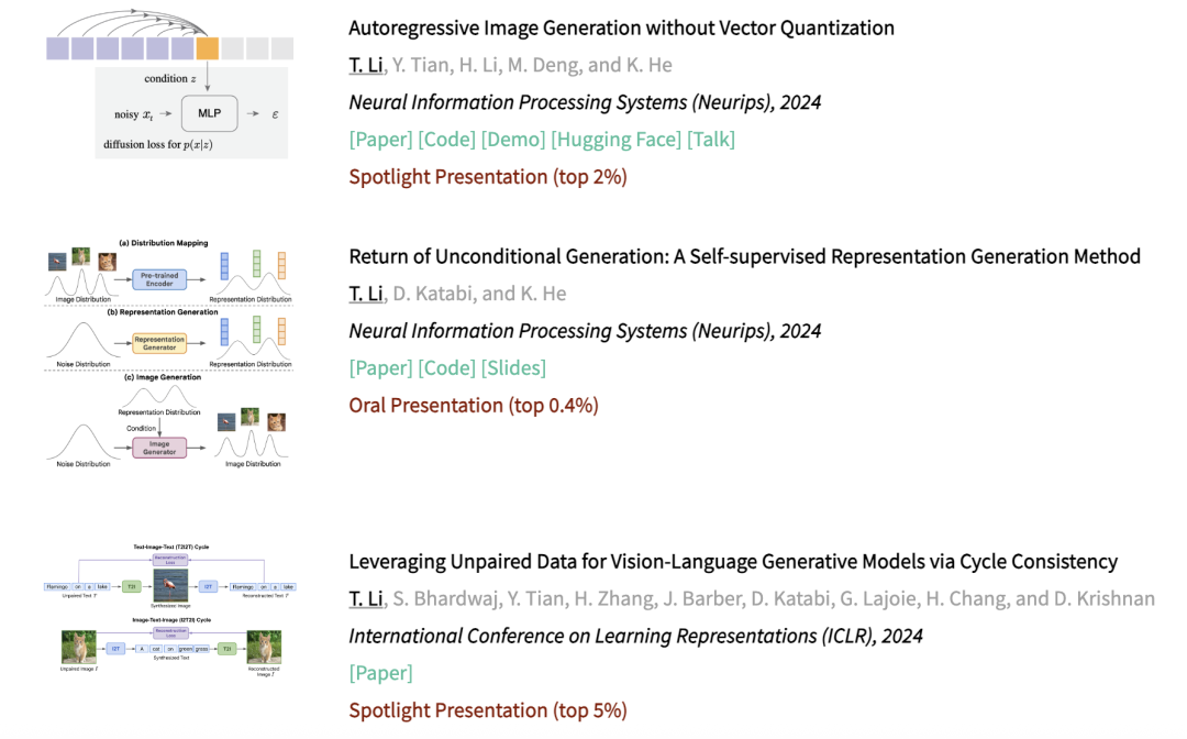 此前曾作为一作和何恺明开发了自条件图像生成框架RCG,团队最新的多项研究中他也都有参与。