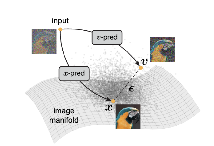 而相反呢,如果让网络直接预测干净的图像,本质上就是让网络学习如何将噪点投影回低维流形,这对于网络容量的要求要低得多,也更符合神经网络“过滤噪声、保留信号”的原本设计。