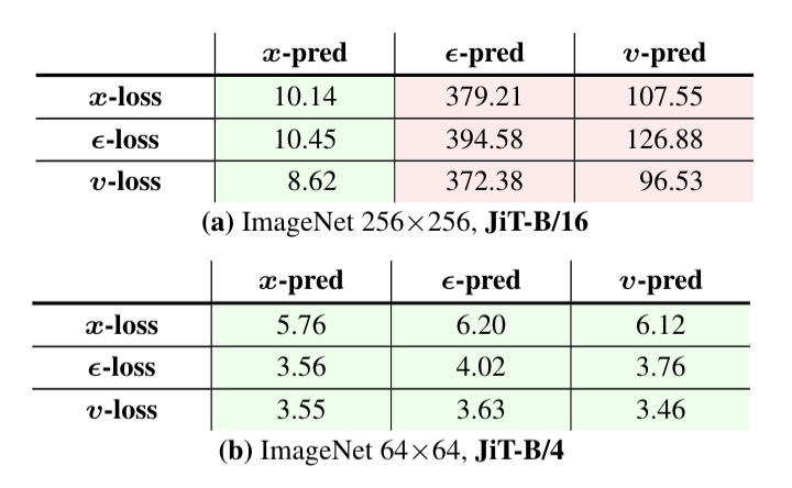 实验结果显示,在低维空间下,预测噪声和预测原图的表现难分伯仲;但一旦进入高维空间,传统的预测噪声模型彻底崩溃,FID(越低越优)指数级飙升,而直接预测原图JiT却依然稳健。