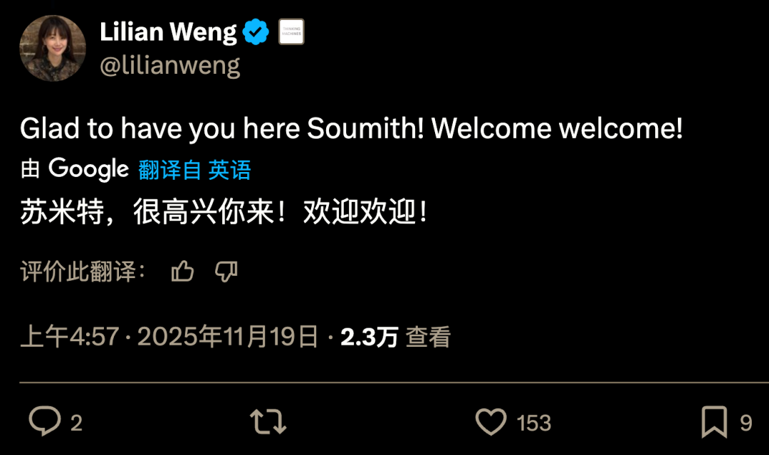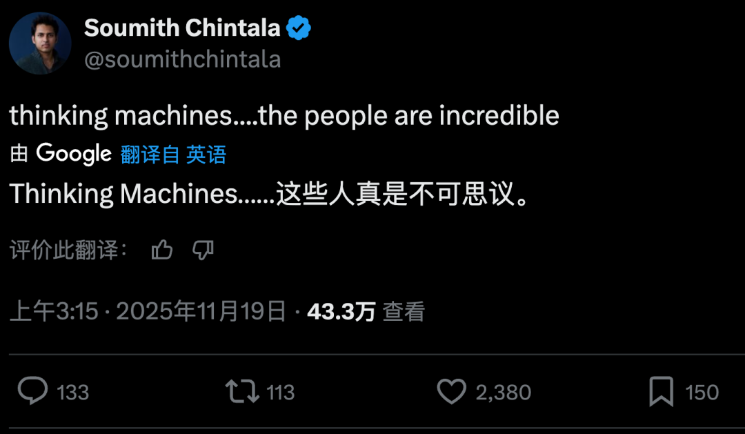 Chintala在社交媒体上更新的状态简洁而充满张力:「Thinking Machines……这里的人简直不可思议。」