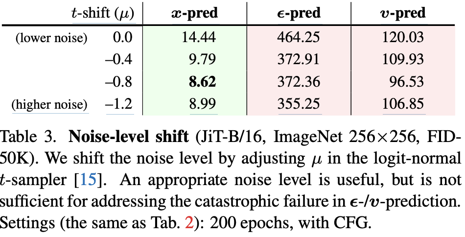 表3展示了在不同噪声水平下(通过调整logit-normal分布的参数µ)各预测方式的FID变化: