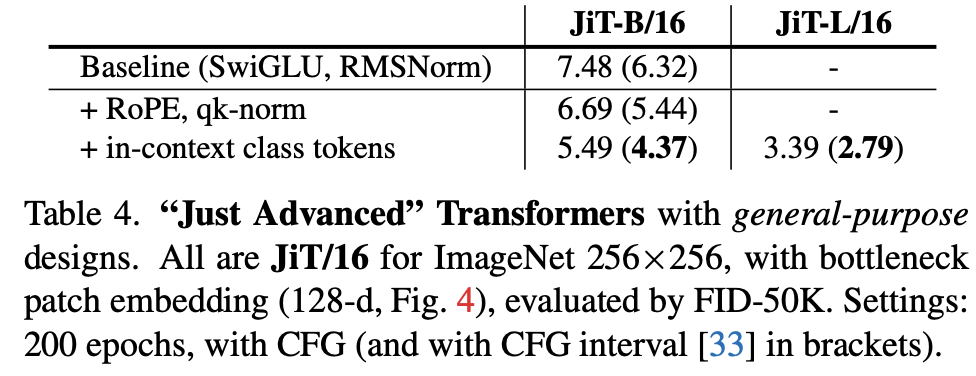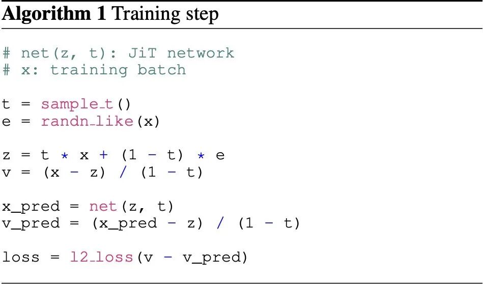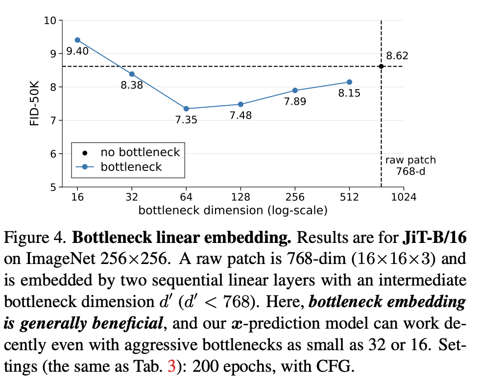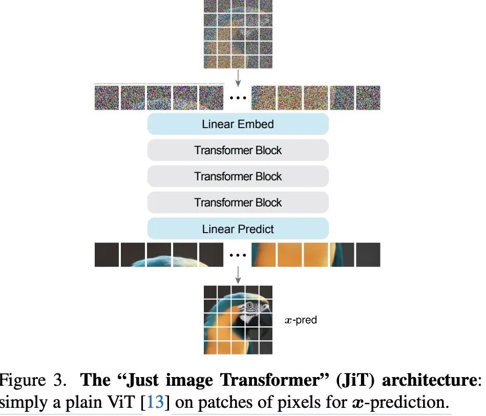 如图3所示,这种结构与DiT(Diffusion Transformer)非常相似,但核心差别在于:JiT直接在原始像素上建模,完全依赖x预测。