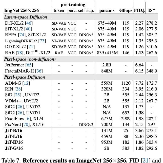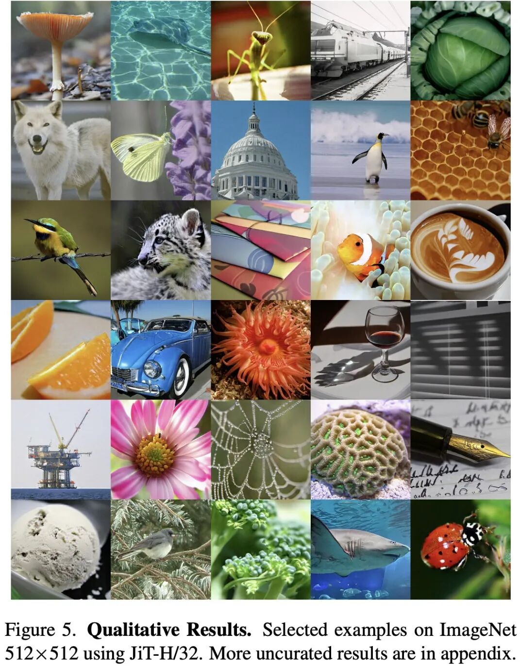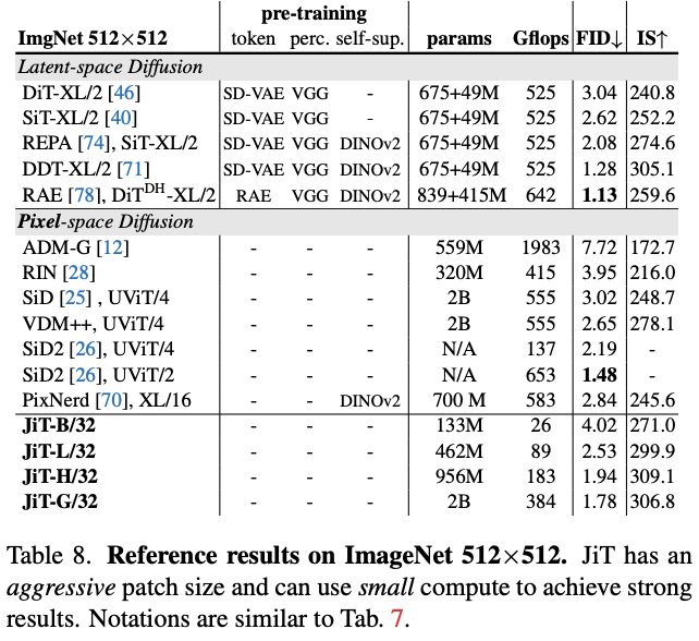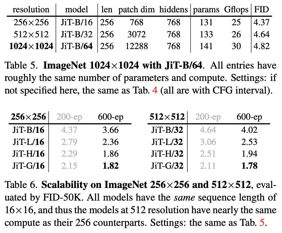 在高分辨率像素生成上,表5表明JiT无惧维度灾难; 表6则验证了JiT的可扩展性。