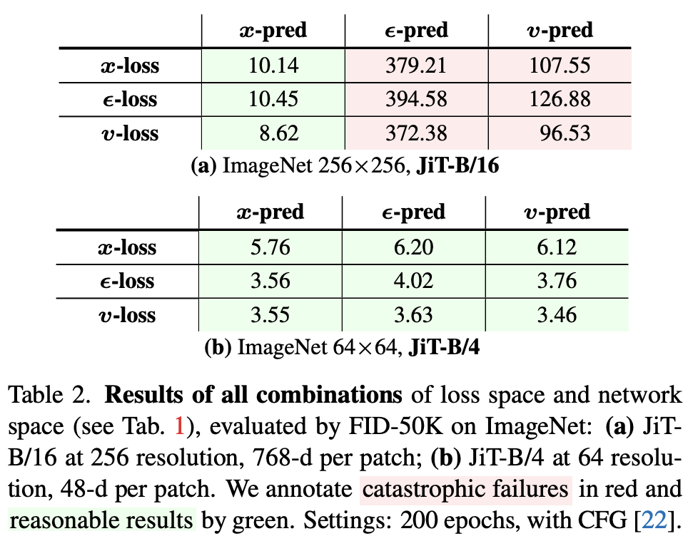 在高维设定(表2(a),ImageNet 256×256,JiT-B/16,Patch维度为768)中,只有x预测在三种损失函数下都表现稳定,FID最低为 8.62;