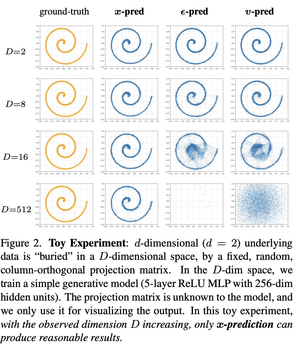 此外,如图2所示,作者通过一个玩具实验展示:当原始低维数据被嵌入更高维空间后,只有x预测仍能稳定生成合理输出,ϵ与v预测则迅速退化。