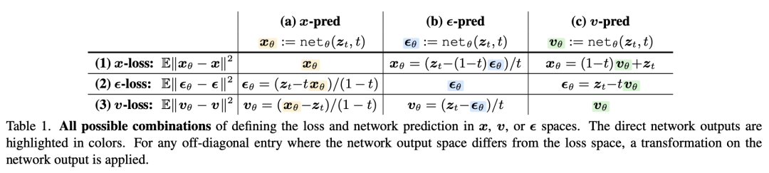 将x、ϵ、v三种预测空间与三种损失空间进行两两组合,总共构成了九种合法的建模形式(见表1)。这些组合在数学上各自有效,但两两之间并不完全等价。