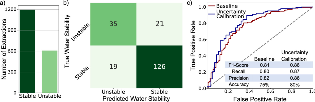 利用 MOF-ChemUnity 的水稳定性数据集,研究人员训练了一个分类器模型,在水稳定性预测中表现优异,准确率达到 80%,F1 分数为 86%(见下图)。更重要的是,由于 MOF-ChemUnity 还包含来自分子模拟的 CO₂ 吸附数据,研究人员可以进行联合筛选,识别同时满足这两个标准的材料。