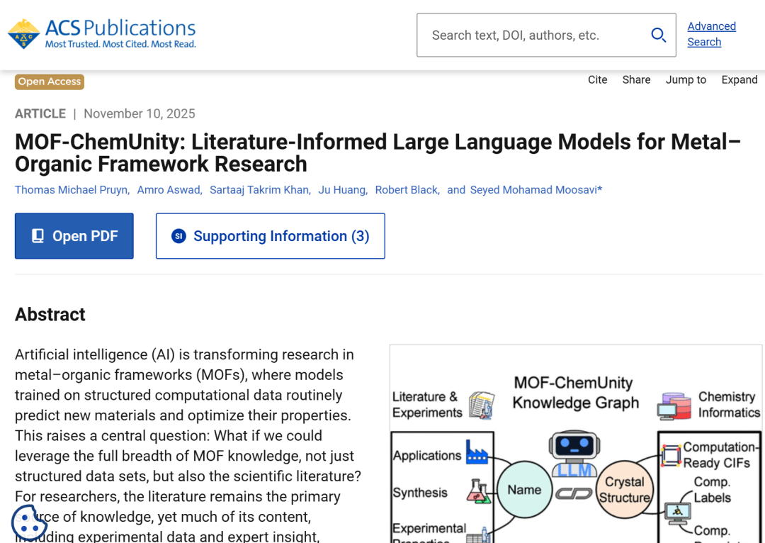 相关研究成果以「MOF-ChemUnity: Literature-Informed Large Language Models for Metal–Organic Framework Research」为题,已刊登 ACS Publications。
