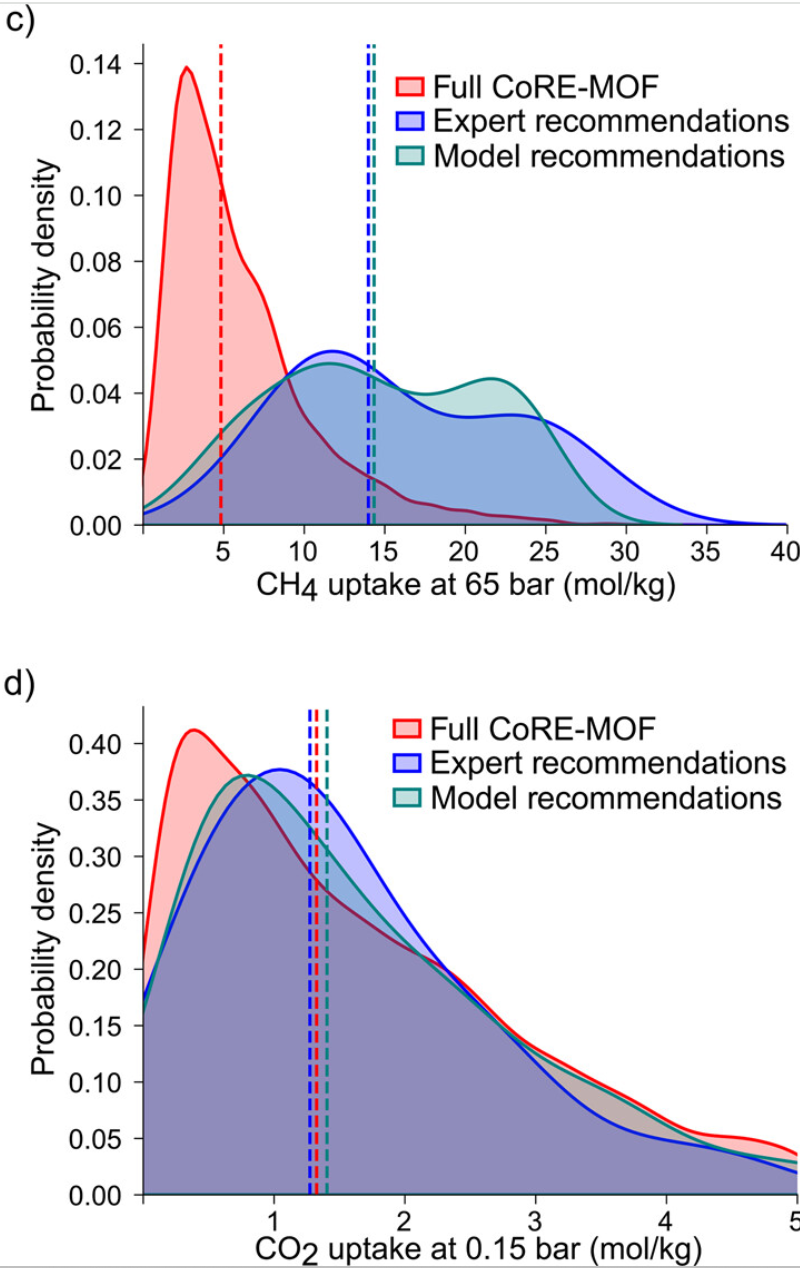 相比之下,对于二氧化碳捕集,专家推荐 MOF 的性能分布与随机样本相似,表明在这一领域,专家直觉的可靠性较低。