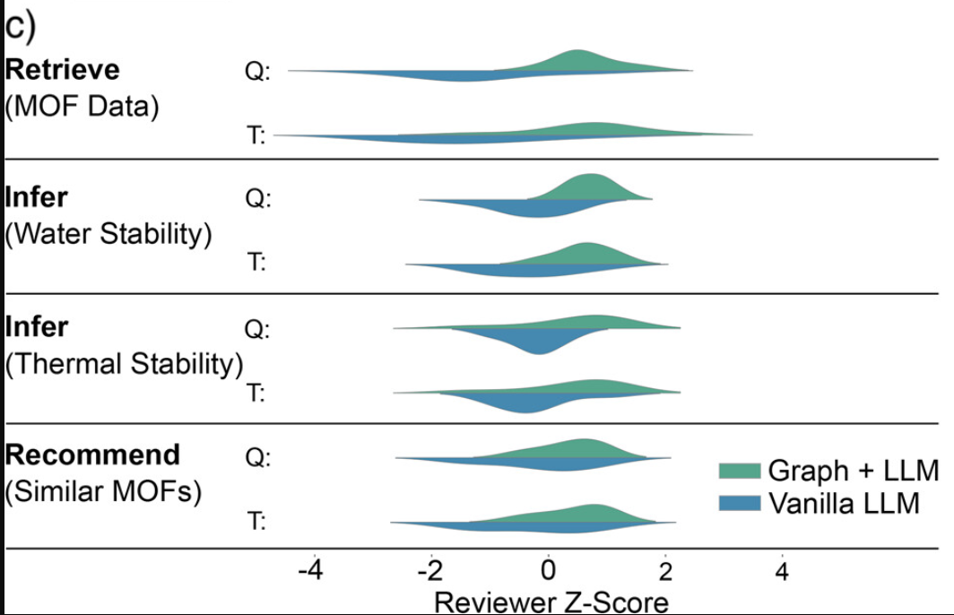 为了进一步评估系统,研究人员还在三个任务上对比了图增强 RAG 和原始 LLM(GPT-4o)的回答:事实检索、结构–性质推断和材料推荐。九位 MOF 专家在盲测调查中评估了回答的质量和可信度。下图 c 显示,图增强助手在所有任务中评分更高。专家特别重视其引用文献、具体示例和可验证的论断,而基线模型的回答常常泛泛、不具依据或无法验证。这表明,将结构化科学知识整合到 LLM 中可提升事实可靠性和用户信任。