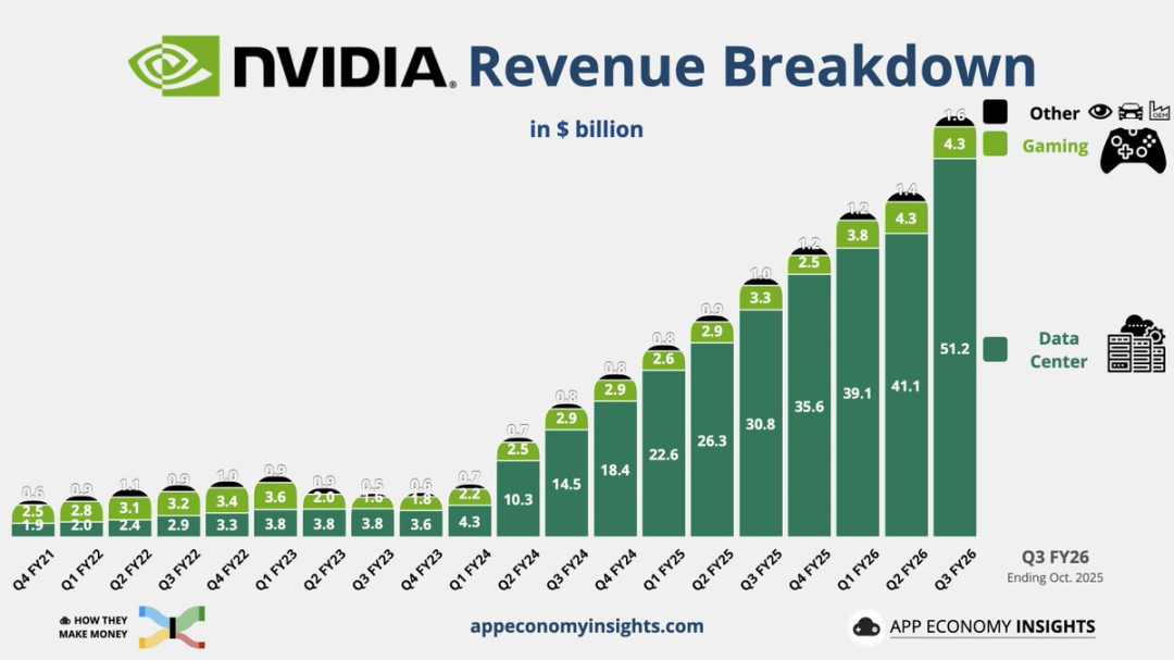 英伟达Q3 2026财报显示,单季度营收达到创纪录的570亿美元,其中AI相关的数据中心业务同比狂涨66%!