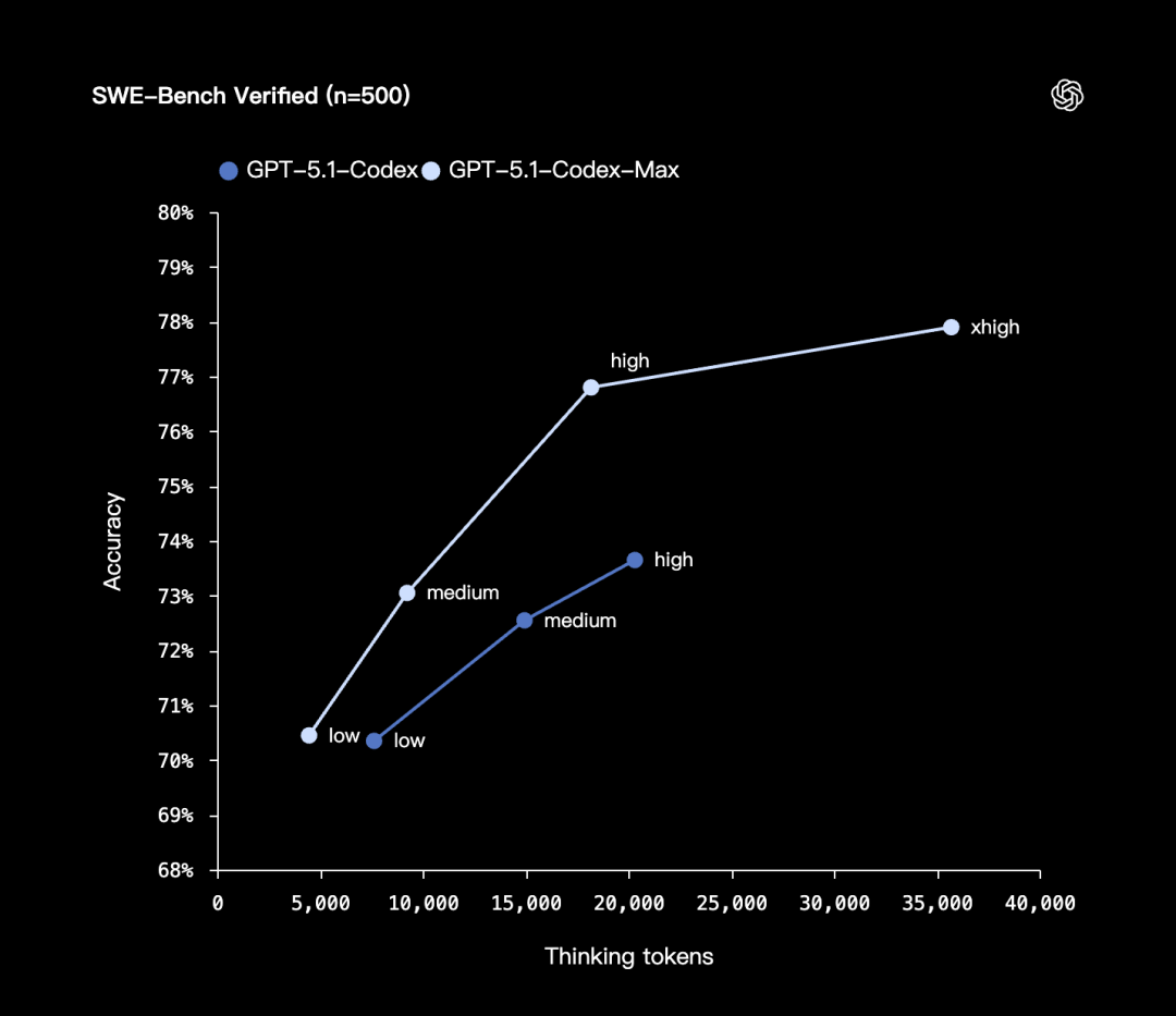 在SWE-bench Verified测试中,同样medium推理力度下,它比之前的GPT‑5.1-Codex性能更好,且思考token使用减少了30%。