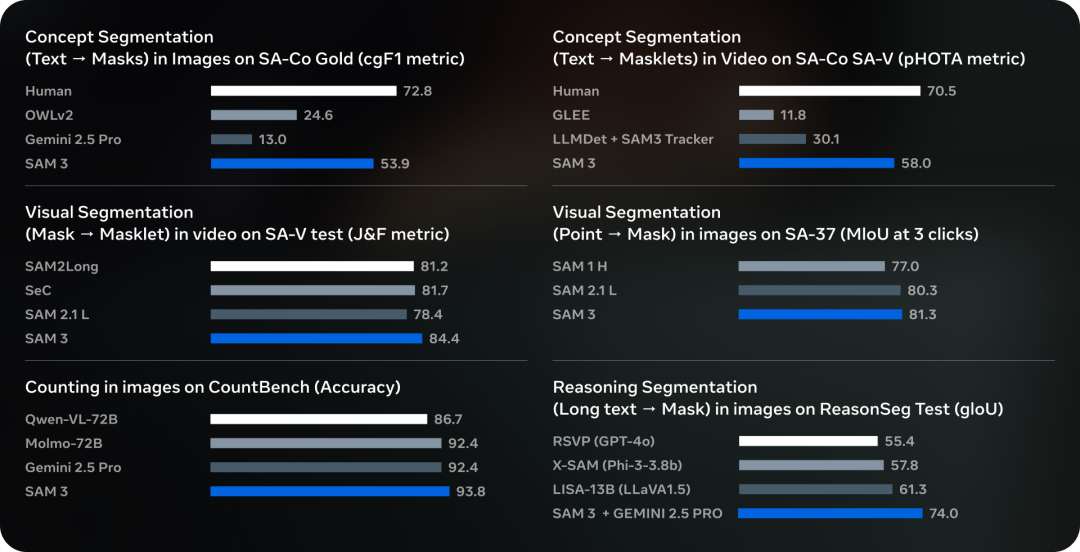 SAM 3 在图像(SA-Co Gold 子集)和视频(SA-Co Video)上的概念分割性能取得了跨越式提升。与现有模型相比,SAM 3 将 cgF1 分数(衡量模型识别与定位概念的能力)提升了两倍。SAM 3 优于基础模型(如 Gemini 2.5 Pro)以及强大的专业模型(如 GLEE)。