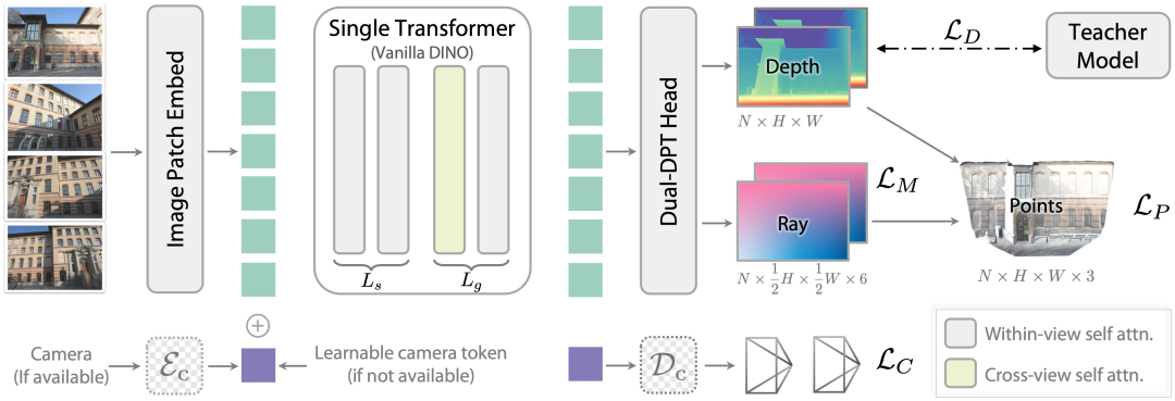本文提出Depth Anything 3(DA3),一种能够从任意数量的视觉输入中预测空间一致几何结构的模型,无论输入是否包含已知的相机位姿。研究人员构建了一个全新的视觉几何基准,涵盖相机位姿估计、任意视角几何重建以及视觉渲染任务。在该基准上,DA3 在所有任务中均取得了新的最先进性能,相较于先前的最先进方法 VGGT,相机位姿估计准确率平均提升 44.3%,几何重建准确率平均提升 25.1%。