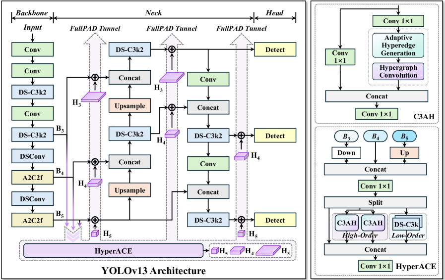 本文提出 YOLOv13,一种高精度且轻量级的目标检测器。研究人员提出一种基于超图的自适应相关性增强机制(Hypergraph-based Adaptive Correlation Enhancement, HyperACE),该机制能够自适应地挖掘潜在的高阶相关性,突破了以往方法仅限于基于超图计算的成对相关性建模的局限,实现了高效的全局跨位置、跨尺度特征融合与增强。