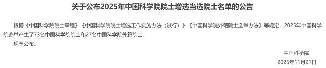 中国科学院选举产生了73名中国科学院院士和27名中国科学院外籍院士。