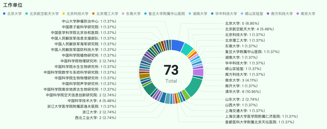 其中,各学部院士数量如下,数学物理学部14人,化学部11人,生命科学和医学学部13人,地学部9人,信息技术科学部11人,技术科学部15人,共73人。