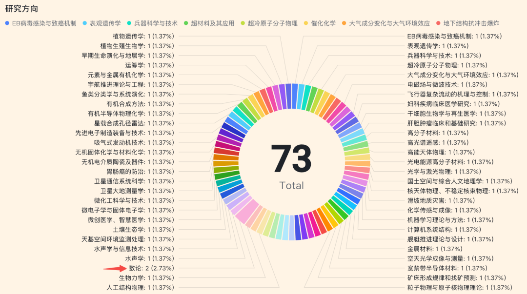 研究方向共72个,其中数论方向入选两位,其他方向均不相同。