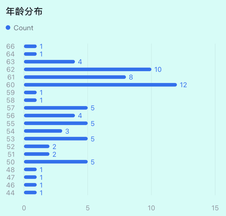 年龄分布上,最大的66岁,最小的44岁。