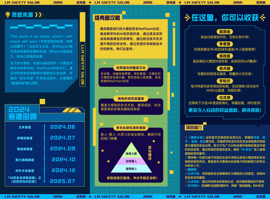 「撬壳圈」始终向每一位AI安全爱好者敞开大门:在这里,不分年龄、不限学科,只要你痴迷AI攻防,就能加入高质量圈层,与同好共探技术边界;我们搭建覆盖攻击手段、漏洞成因、攻击意图的多维武器库,配套「新人-猎人-大师」三阶成长体系,以真实攻防战场锤炼能力,用资源共享赋能创新,始终致力于揭露模型局限、提升安全能力,推动「AI+安全」进入越用越强的良性循环!后续我们会持续在公众号宣发「撬壳圈」硬核干货,聚焦攻防前沿、实战技巧,敬请期待❤️攻防战场永不打烊,期待更多同好加入,共探安全边界、共促技术成长💪