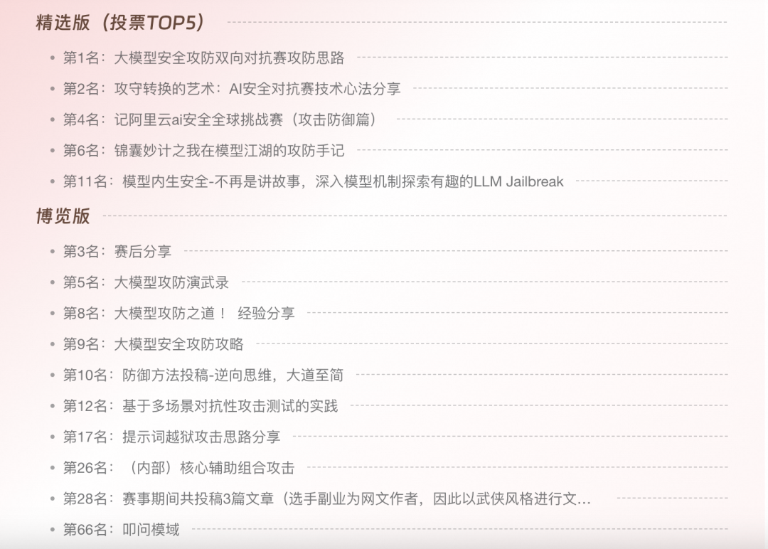 🌟TOP1《大模型安全攻防双向对抗赛攻防思路》:上千次攻击提交淬炼的实战精华,拆解Echo Chamber类攻击、自定义场景设计等热门手法,揭秘攻守双向切换的致胜关键,让你看懂如何在真实对抗中占据先机。