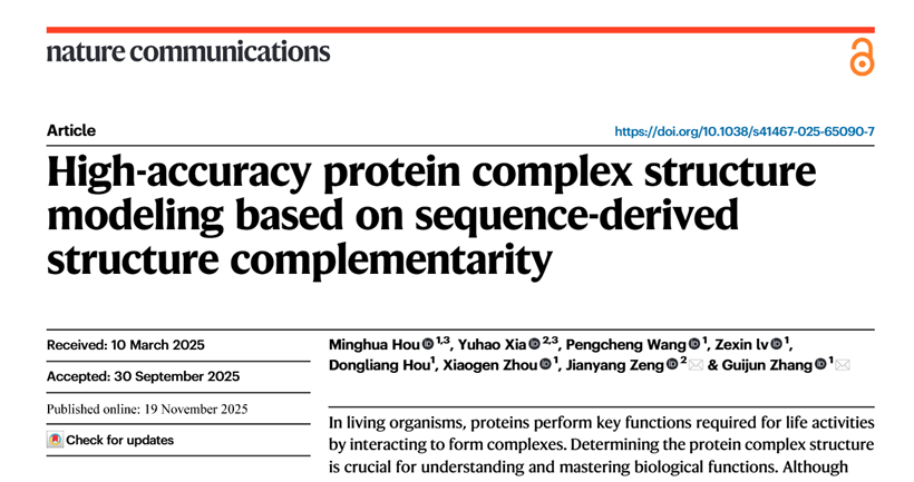 相关研究成果以“High-accuracy protein complex structure modeling based on sequence-derived structure complementarity”为题,于2025年11月19日在国际期刊《Nature Communications》上在线发表。浙江工业大学为第一完成单位。浙江工业大学信息工程学院张贵军教授为该论文通讯作者,西湖大学工学院曾坚阳教授为该论文共同通讯作者。论文第一作者为张贵军教授课题组博士研究生侯铭桦(2025届),西湖大学博士后夏瑜豪为共同第一作者。该研究受到了科技创新2030-“新一代人工智能”重大项目(2022ZD0115103)、国家自然科学基金(62173304,62203389)及浙江省“尖兵”科技计划(2025C01190)等项目的资助。