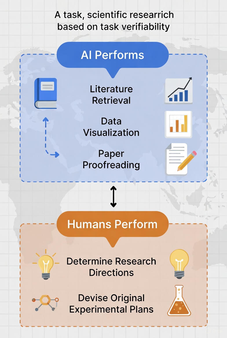 而难以验证的的部分,例如确定研究方向,给出原创的实验方案等,由于「重要性」,「创新」由共同体长期共识决定,这些子任务上则应当由人来执行。