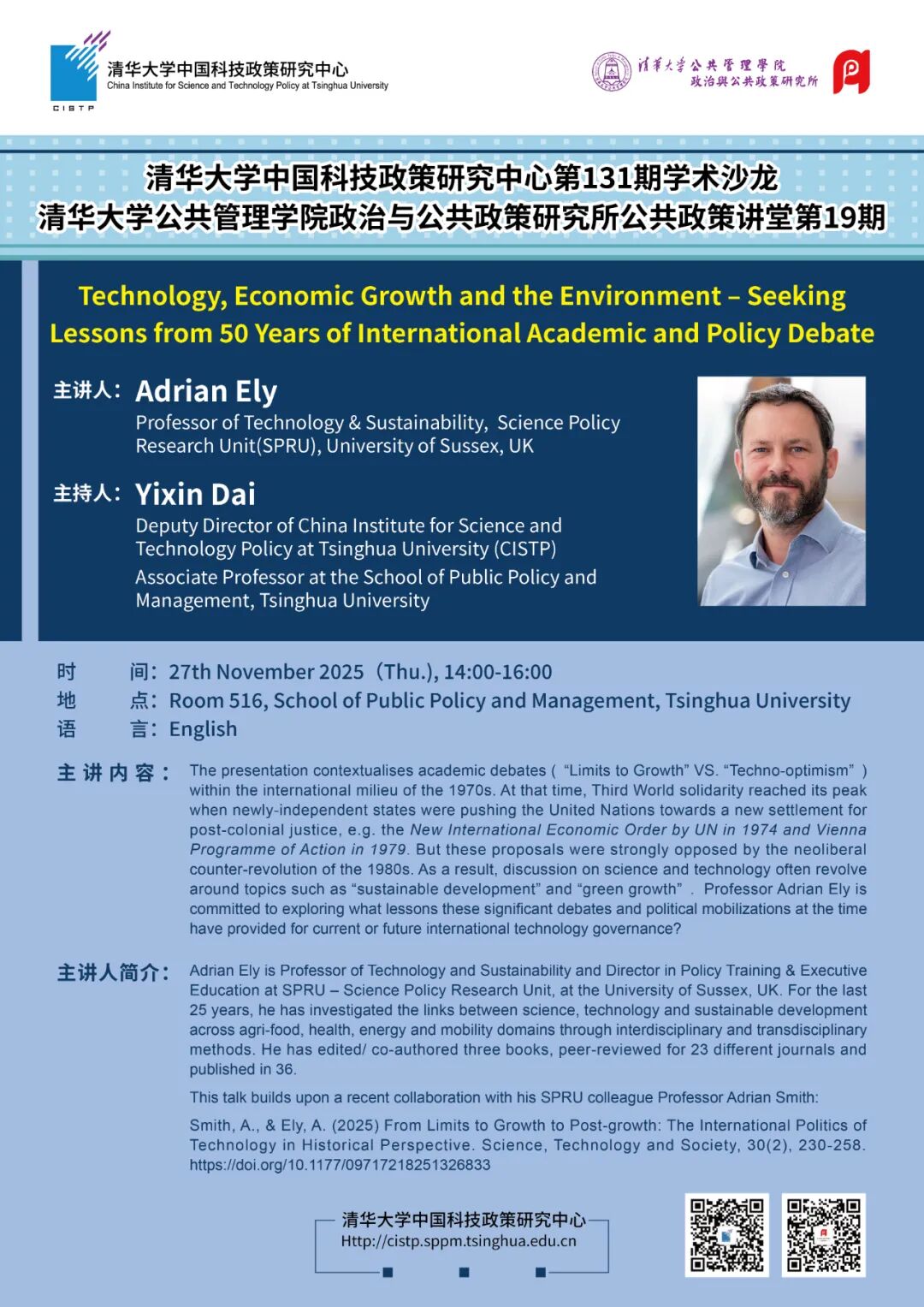 讲座将“增长的极限”与“技术乐观主义”等学术争论,置于 20 世纪 70 年代的国际背景之中加以考察。当时,第三世界团结力量达到巅峰,新独立国家试图推动联合国建立一种面向后殖民正义的新国际秩序,例如联合国在 1974 年提出的《建立新的国际经济秩序宣言》以及 1979 年的《维也纳行动纲领》。然而,这些倡议在 1980 年代遭遇新自由主义“反革命”的强力反对。其结果是,关于科学和技术的讨论逐渐被“可持续发展”“绿色增长”等主题所框定。Ely 教授致力于探究:这些重要的思想争论与政治动员,为当下或未来的国际科技治理提供了哪些启示?Adrian Ely 现任英国萨塞克斯大学科学政策研究所(SPRU)技术与可持续发展教授,并兼任政策培训与高管教育主任。在过去 25 年中,他围绕科学、技术与可持续发展之间的关系,在全球不同地区的多个领域开展研究。自攻读研究生期间从事转基因作物环境风险研究以来,他始终关注新兴生物技术的监管与治理,尤其是其在农业与食品体系中的应用。