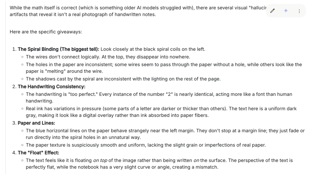 我们截图发给Gemini,Gemini也说是AI生成的,仔细看其笔迹过于完美,每个数字“2”的写法几乎完全一样。