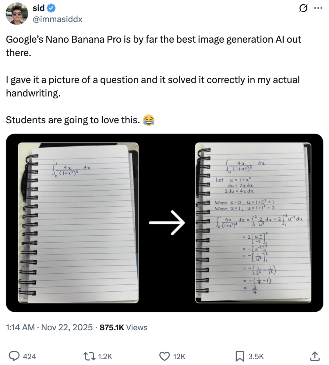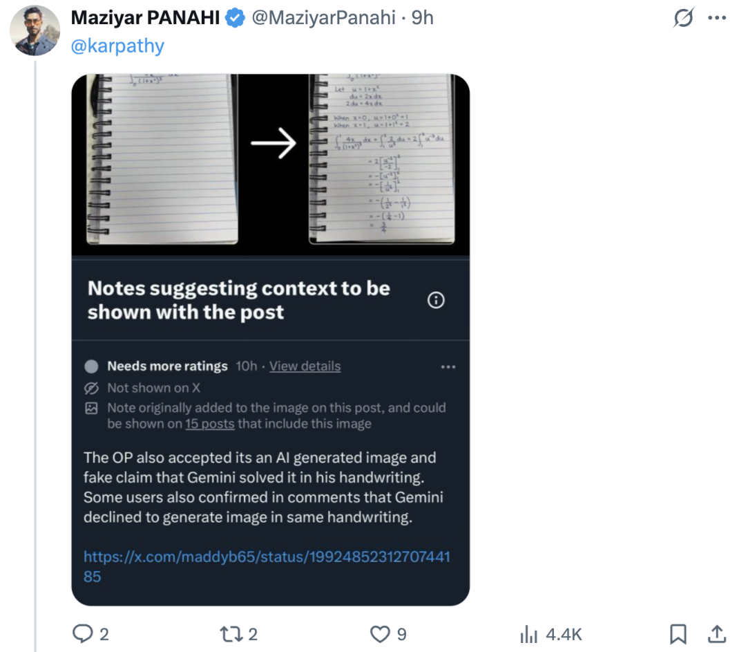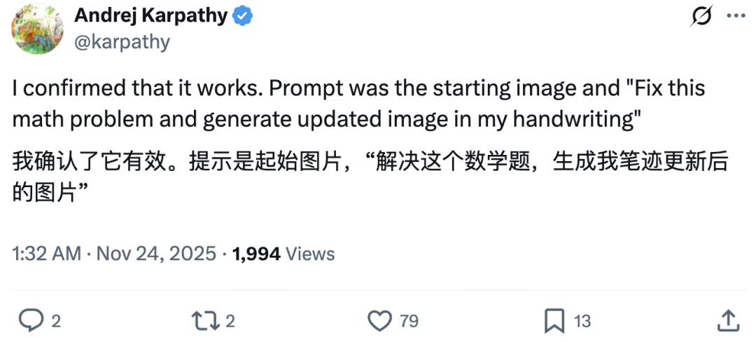 随后卡帕西验证后表示Nano Banana的确能做到,prompt是起始图片+“解决这道数学题,然后用我的手写字体生成更新后的图片”。