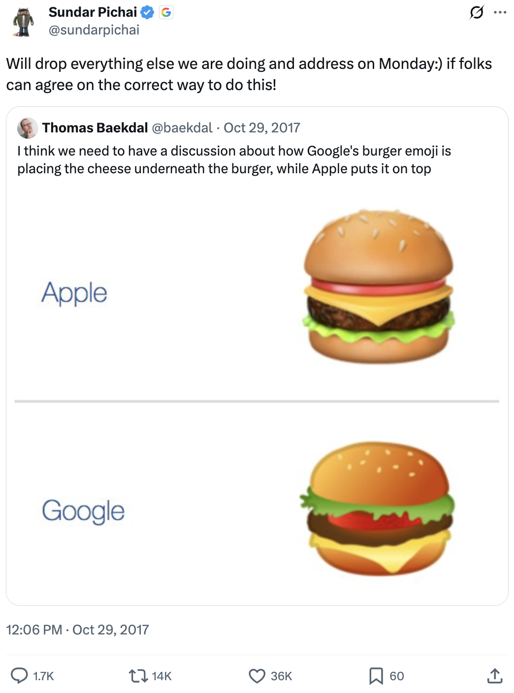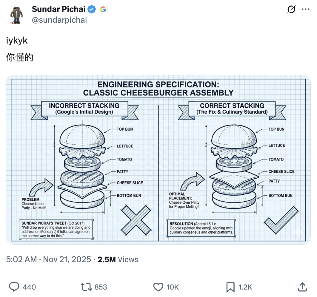 劈柴哥当年半开玩笑地道歉,调侃谷歌要“放下所有工作”解决芝士汉堡emoji的错误结构。后来在Android 8.1系统中,谷歌把emoji修正为芝士在肉饼上的版本。