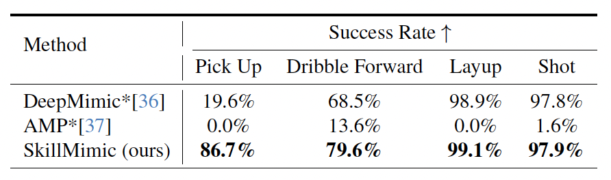 实验表明,SkillMimic能够使用同一套配置学会多种风格的篮球技能(运球、上篮、投篮等),成功率显著高于DeepMimic和AMP。