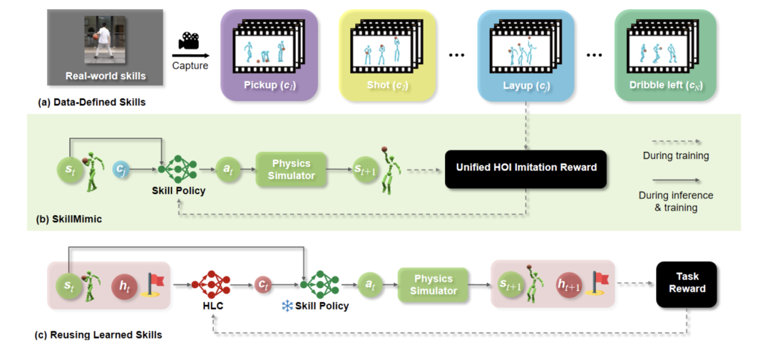- 分层学习架构(Hierarchical Solution):低层:交互技能策略(IS Policy):通过SkillMimic框架学习各种基础交互技能(如运球、上篮)。高层:高级控制器(HLC):训练一个高级策略来复用和组合已习得的IS策略,以完成长程复杂任务(如连续得分)。