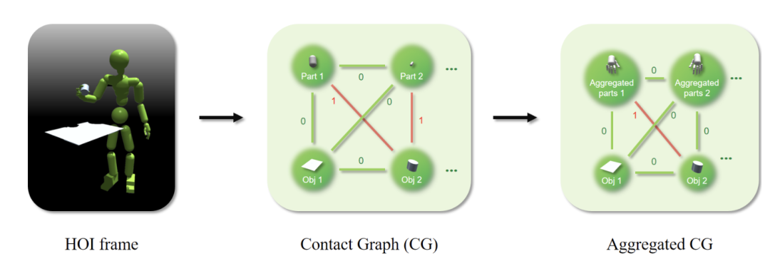 给定一个HOI帧,接触图节点包含所有身体部位和物体。每条边都是一个二元接触标签,表示接触与否。为了简化计算,还可以将多个身体部位聚合到一个节点中,形成聚合接触图。