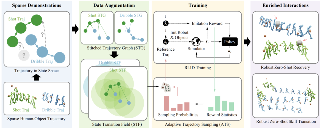 其通过引入拼接轨迹图(STG)与状态转移场(STF)、自适应轨迹采样(ATS)等技术,成功地在低质量数据条件下,训练出了兼具鲁棒恢复能力与技能迁移能力的复杂交互策略 。