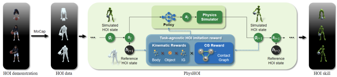 为实现这一点,PhysHOI在当时提出了一种基于物理仿真的动态人-物交互(HOI)模仿学习框架。