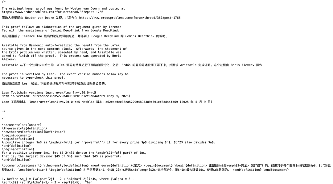 两天后,Boris Alexeev使用Harmonic的Aristotle工具(可直接从英语/LaTeX源代码中自动形式化处理),完成了对该证明的Lean形式化,总耗时两到三小时。