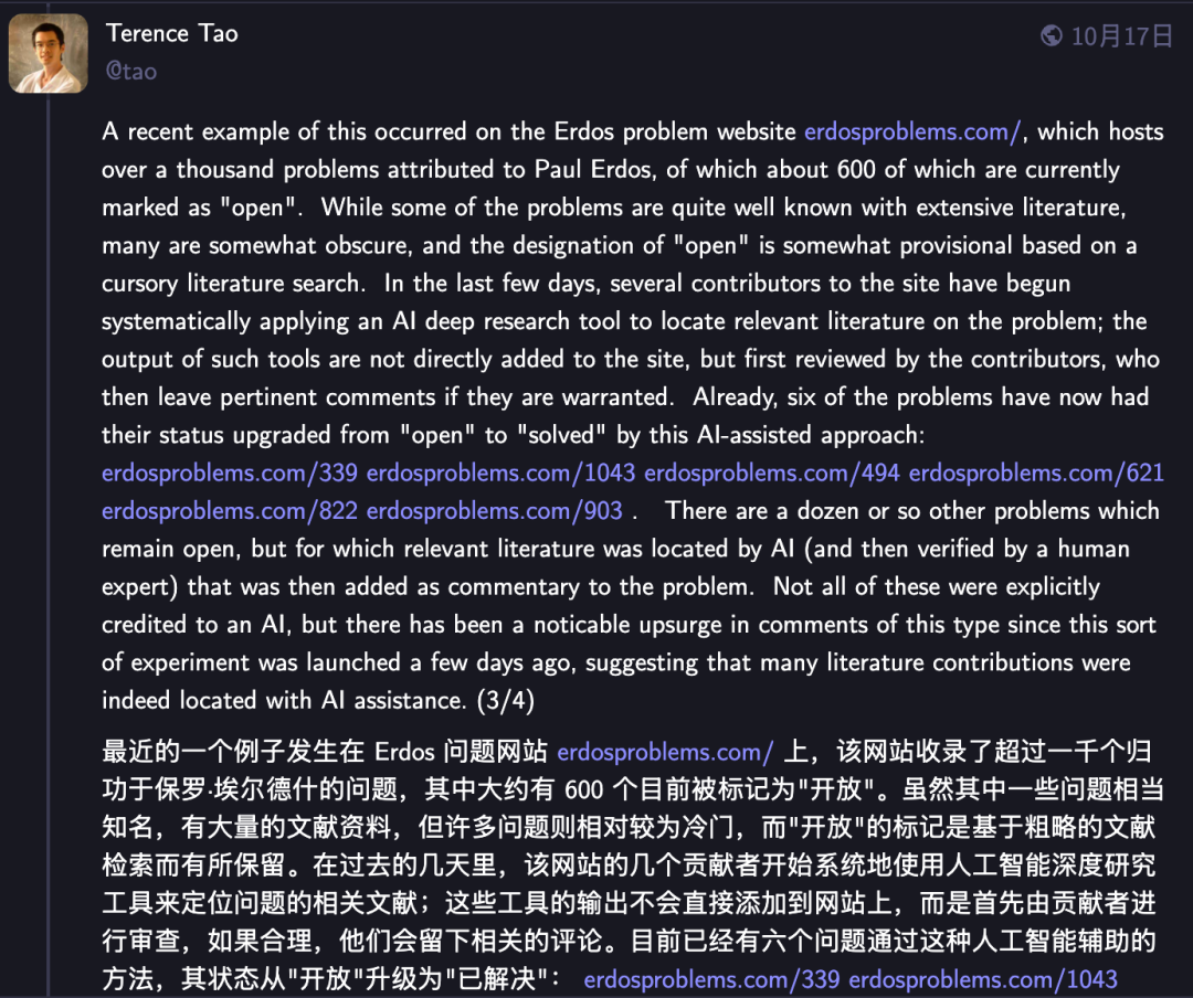 而这也并非孤例,陶哲轩发现,在Erdős问题网站上,类似的情况时有发生,最近陆陆续续有6个困扰数学界多年的Erdős难题通过AI辅助方法,得以解决。