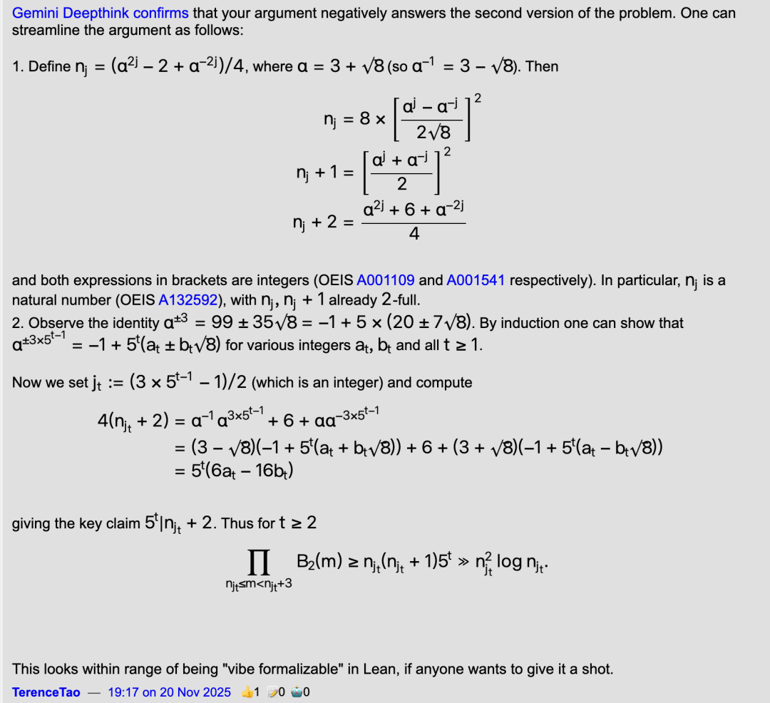 陶哲轩注意到了这个过程,于是将该恒等式连同问题本身一起交给了Gemini Deep Think进行完整证明,并确认整个论证过程。