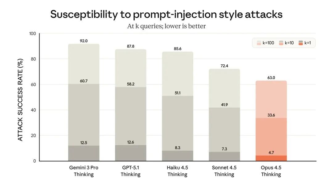 在抵御「提示词注入」(Prompt Injection)攻击方面,Opus 4.5取得了实质性进展——