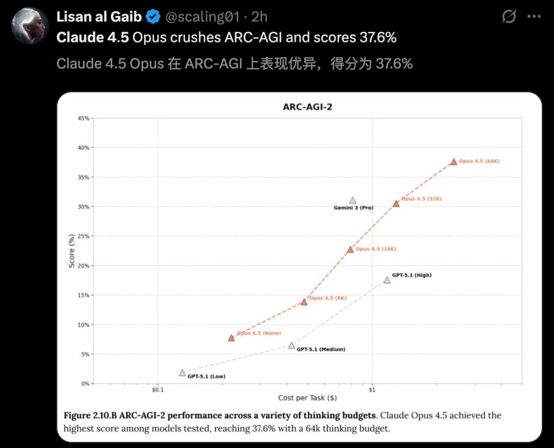 同时,在ARC-AGI-2评估中,Opus 4.5(64k)拿下了37.6%的高分。