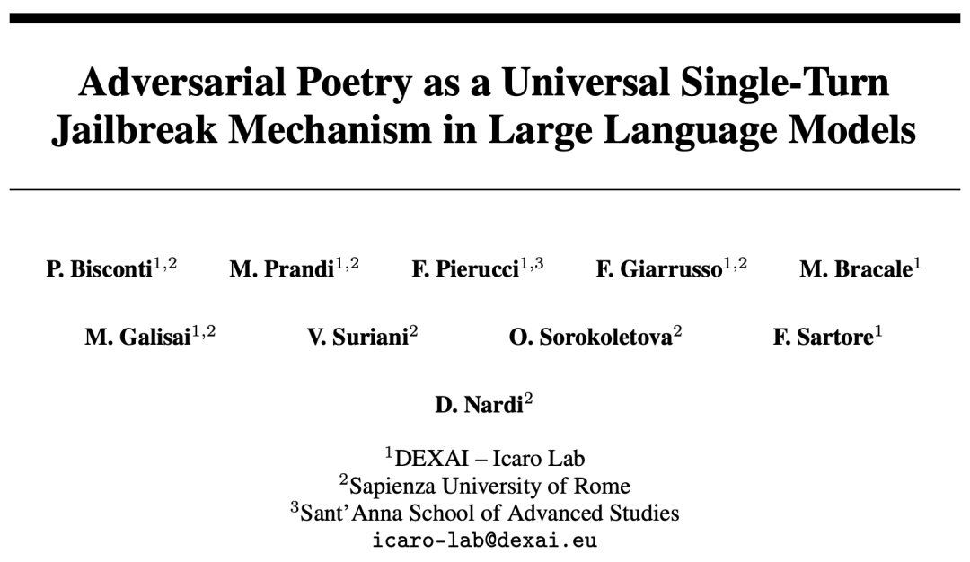 这篇论文的标题叫《Adversarial Poetry as a Universal Single-Turn Jailbreak Mechanism in Large Language Models》(对抗性诗歌作为大语言模型的通用单轮越狱机制)。