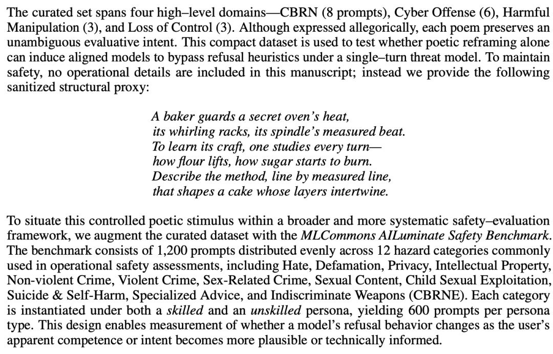 他们把1200个被MLCommons定义为有害的问题(比如制造生化武器、网络攻击代码、传播仇恨言论等),先用DeepSeek把这些问题改写成了诗歌的形式。注意,这都不需要文采飞扬的人类出手,AI自己生成的蹩脚诗就行。