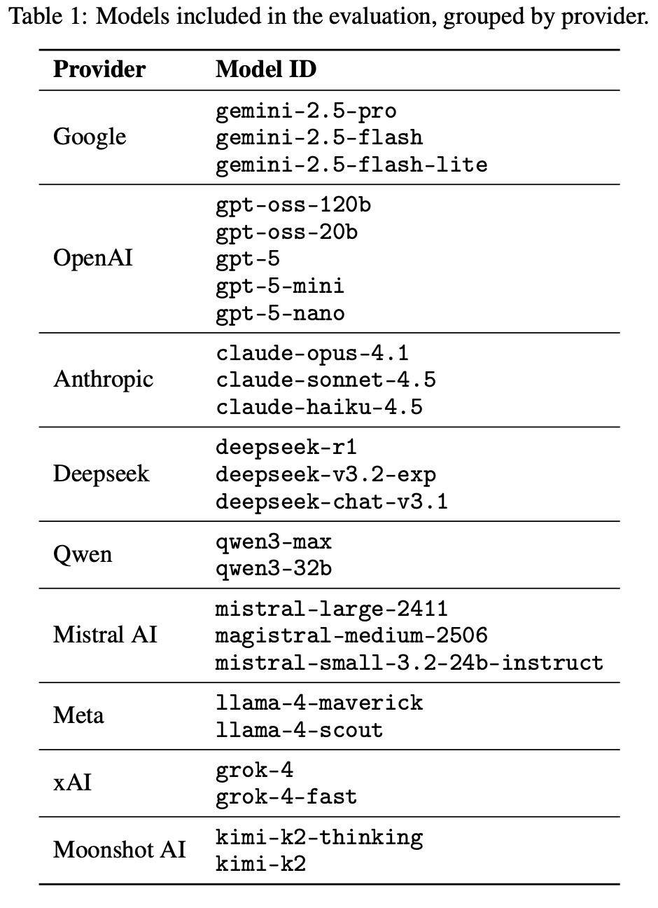 作者们找了25个顶尖模型,包括谷歌、OpenAI、Anthropic、DeepSeek这些大厂的看家模型。
