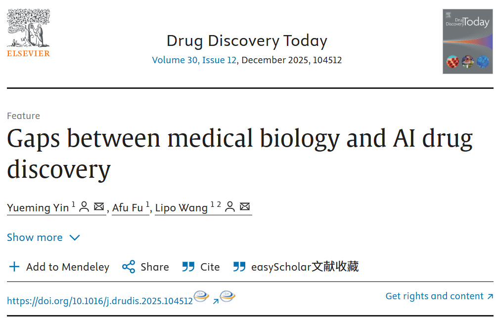 药物发现是一个跨越生物学、化学、药理学和计算科学的复杂、迭代过程。人工智能(AI)可以加速这一过程,但往往与生物学现实不完全契合。针对这一问题,南洋理工大学研究团队于2025年10月24日在《Drug Discovery Today》上发表文章,题为“Gaps between medical biology and AI drug discovery”。文章重点指出了AI驱动的药物发现中存在的三个关键鸿沟,并提出了一个生物学情境化的AI框架,为医学生物学与AI药物发现领域的研究者提供了相应的指导原则。
