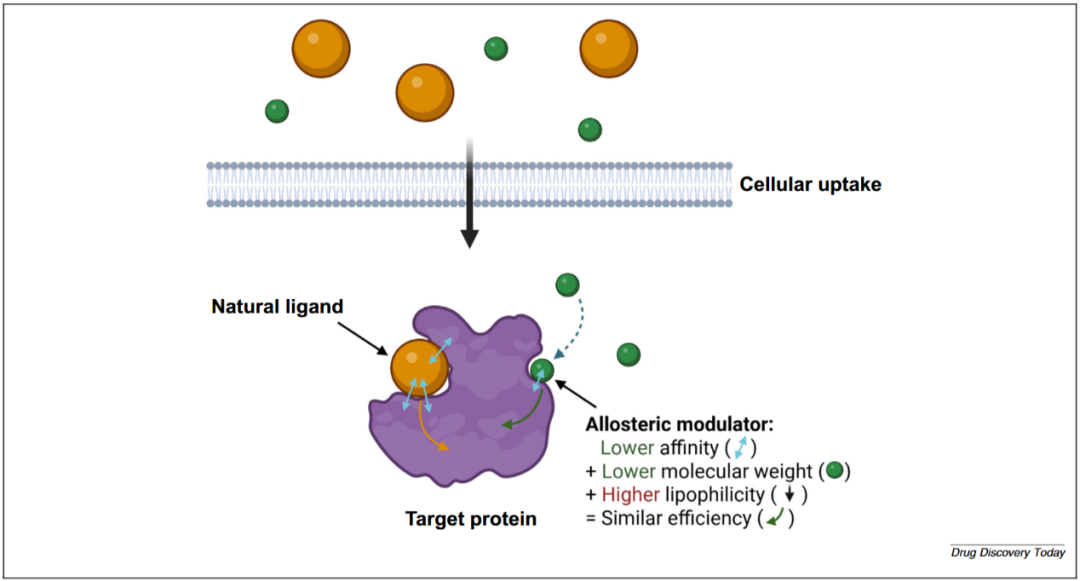 结合亲和力与生物活性本质上是两个截然不同的概念,然而许多AI驱动的药物发现方法却使用同一种模型来同时预测二者。从定义上看,生物活性指的是某种物质在生物体系中诱导生理或生化效应的能力,通常用于描述分子、药物或化学物质对生物体的影响;而结合亲和力则是指生物分子与其结合配体之间相互作用的强度。两者之间并不存在单调对应关系。如图1别构调节剂例子所示,较低的结合亲和力可通过减小分子量与增强脂溶性得到补偿,从而实现相似的结合效率或生物活性。